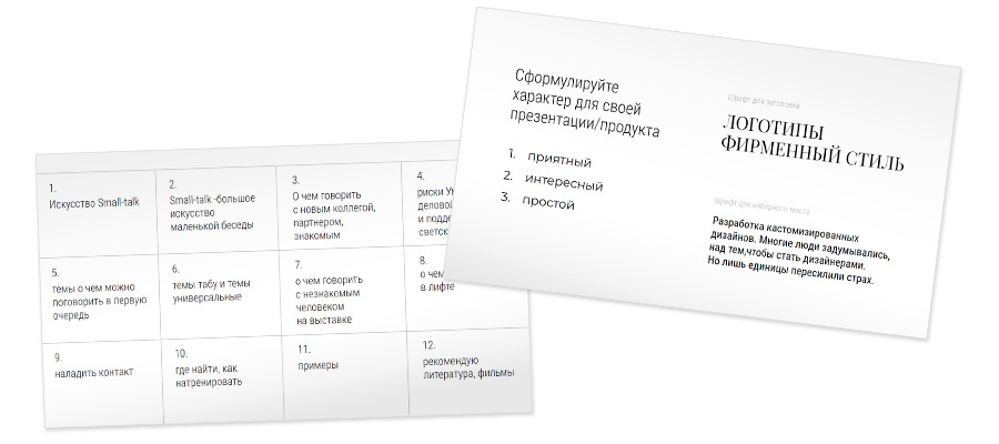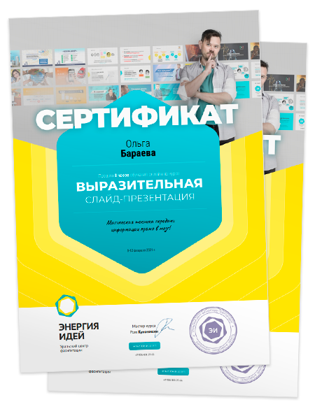 В конце занятия в голове (и в руках) уже готовый план презентации. Который я сам бы точно не сделал НАСТОЛЬКО понятным и красивым. Огромное спасибо за обучение! »